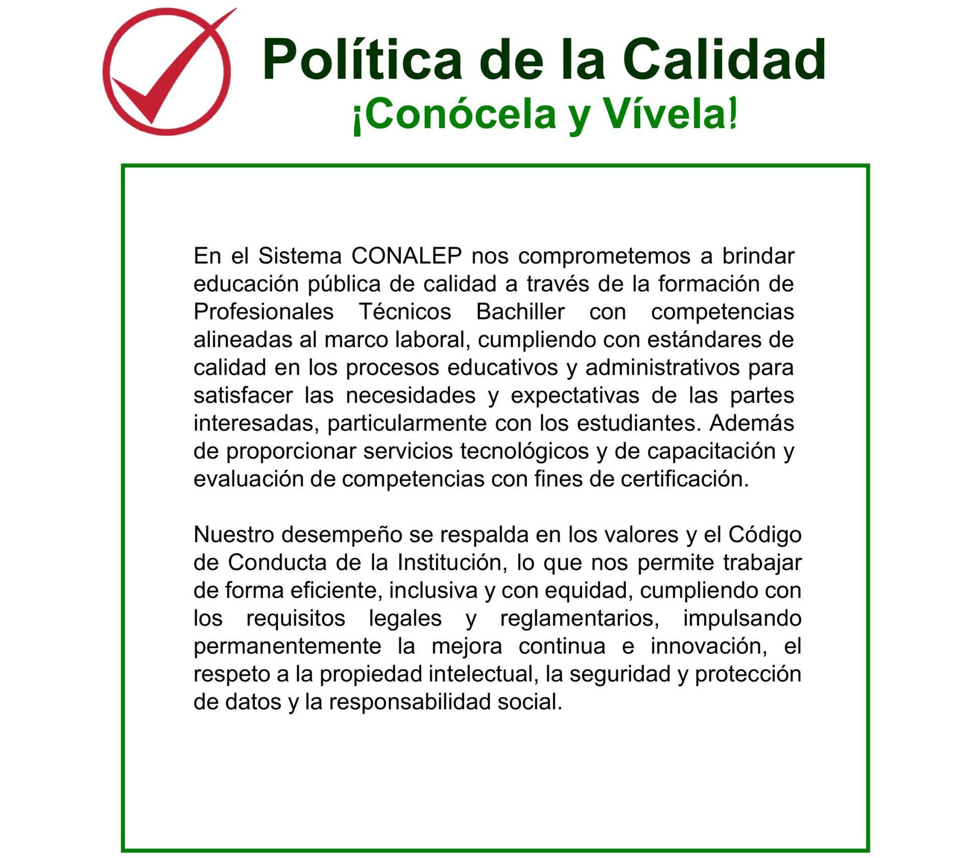 Quienes conformamos el Sistema Conalep, tenemos como compromiso realizar un trabajo profesional en la prestación de nuestros servicios educativos, sustentado en valores institucionales y orientando a la búsqueda permanente de un mayor impacto social, cumpliendo con los requisitos de nuestros clientes, así como los legales aplicables, mejorando continuamente la eficacia del Sistema de Gestión de la Calidad con apego a la norma ISO 9001:2000.